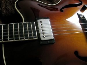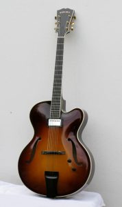 This guitar has similar body dimensions to the classic ES175. It is however fully carved and not over-built like many factory guitars. It has enough acoustic power to hear comfortably at home and it has good tolerance to feedback on a gig.