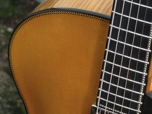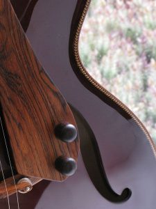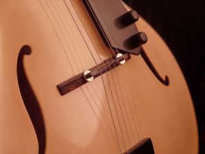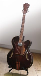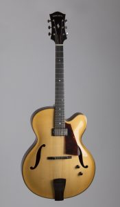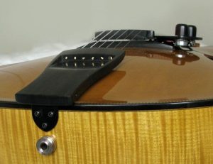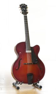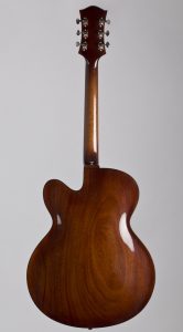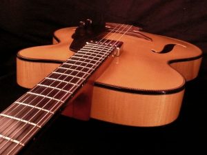 This design has been carefully refined and modified since 2007. It has a full-bodied sound which rivals heavier built archtops. While many professional musicians stick to laminated instruments due to ease of use, a fully carved archtop, when amplified properly, produces a more individualistic sound and more tonal nuances.