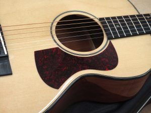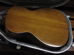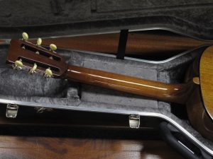 This guitar was commissioned to incorporate features of early 20th century small-body guitars of the Gibson and Martin companies. One of the customers main requirements was that the guitar be as plain as possible without fussy ornamentation. The slotted headstock is reminiscent of Martin styling, while the body and bracing pattern is closer to the Gibson 00 guitars.